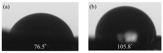Hydrophobicity measurements primarily aim to assess the changes in the surface properties of materials after adding graphene to pure PVDF. By measuring the water contact angle, the hydrophilic or hydrophobic properties of the materials can be understood. This information directly impacts the stability and performance of sensors and contributes to the design and optimization of sensors. Graphene possesses a high surface area and excellent hydrophobicity, making it a common additive in composite materials. The water contact angle of PVDF films prepared by electrospinning without graphene is 76.5°. However, with 5 wt% graphene, the water contact angles increase to 105.8°, showing an upward trend, as illustrated in Figure 3. The introduction of graphene promotes the formation of more β-crystal phases, possibly due to graphene restricting the molecular chain movement of PVDF, leading to the generation of more β-crystal phases during the electrospinning process. The results indicate that the nanostructure of PVDF/graphene composite fibers increases their surface roughness, thereby enhancing the hydrophobicity of the films.