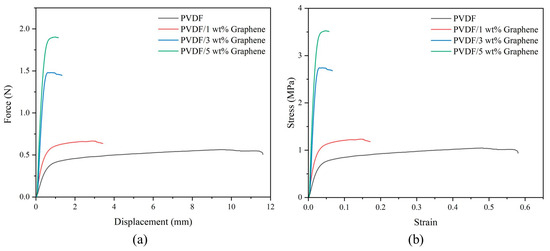 Tensile test of pure PVDF and 1 wt%, 3 wt%, and 5 wt% PVDF/graphene fibers. (a) Force–displacement curve, (b) stress–strain curve.