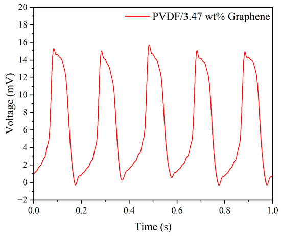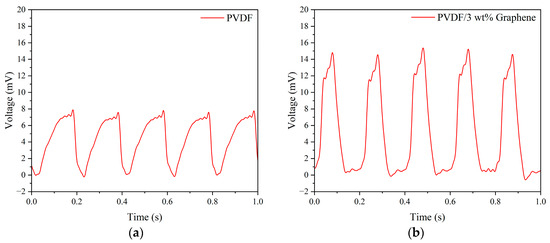 The electrical properties of piezoelectric fibers made with different concentrations of graphene were analyzed. The fibers were subjected to vertical tapping using a fixed frequency of 5 Hz and a force of 5 N applied by a tapping device. Figure 5 illustrates the output voltage for pure PVDF and PVDF fibers with 3 wt% graphene added under these tapping conditions. The average maximum output voltage for pure PVDF fibers was 7.74 mV. Among all concentrations of graphene, the composite fibers with 3 wt% graphene exhibited the highest output voltage, with an average maximum output voltage of 14.93 mV, approximately 1.93 times that of pure PVDF fibers. The results indicate superior performance for fibers with added graphene compared to pure PVDF fibers.