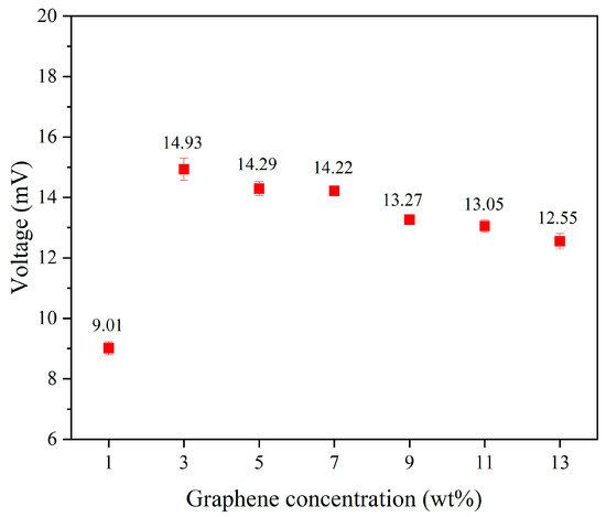 The average output voltage values of piezoelectric fibers with graphene concentrations range from 1 to 13 wt%.