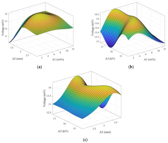 Kriging response surfaces for two factors from the uniform experimental design table. (a) Graphene weight percentage (wt%) and the distance between the needle and the disk collecting device (mm), (b) graphene weight percentage (wt%) and applied voltage (kV), and (c) distance between the needle and the disk collecting device (mm) and applied voltage (kV).