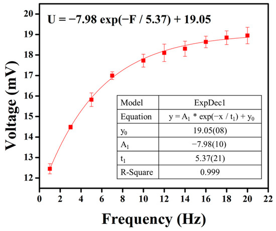 Subsequently, frequency tests were conducted on the optimized parameters of the piezoelectric sensor, tapping at frequencies ranging from 1 to 20 Hz under a 5 N force. The relationship between each frequency and the voltage output of the piezoelectric sensor is illustrated in Figure 9. The experimental results show that as the tapping frequency increases, there is a trend of elevated output voltage. This suggests that the higher frequency of impacts applied to the piezoelectric material per second may lead to more frequent deformation of the crystal structure, resulting in increased charge separation. The frequency–voltage relationship was modeled using curve fitting, and the relationship is described by the equation U = −7.98 exp(−F/5.37) + 19.05. As the frequency continues to rise, the voltage output approaches a limit of 19.05 mV.