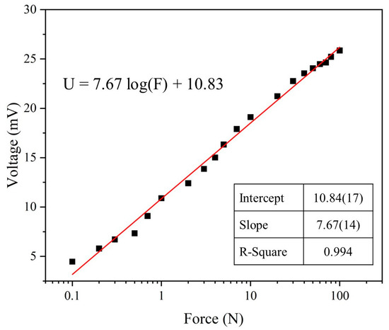 Finally, force tests were conducted on the optimized parameters of the piezoelectric sensor, subjecting it to impacts ranging from 0.1 N to 100 N at a frequency of 5 Hz. The relationship between each force level and the sensor’s output voltage is illustrated in Figure 10. The force-to-voltage conversion is represented using a logarithmic scale for the force. The relationship is described by the equation U = 7.67 log(F) + 10.83, where U is the voltage in millivolts (mV) and F is the force in newtons (N). The sensitivity (S) of the piezoelectric sensor is 7.67 log(mV/N), with a determination coefficient (R2) of 0.994. The force-to-voltage relationship graph provides a means to assess the magnitude of the force acting on the piezoelectric sensor.
