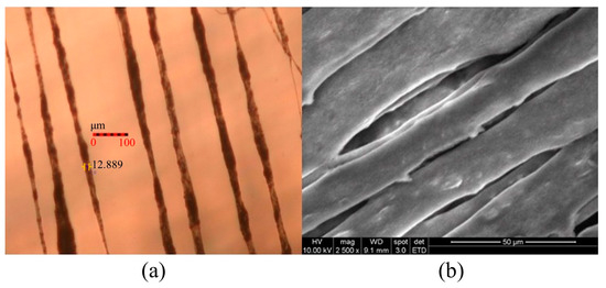 With the increased electrostatic field, the Taylor cone formed by the PVDF solution enlarges, resulting in a higher jetting rate, increased stretching force, and reduced fiber diameter. Graphene enhances conductivity, making the solution easier to eject, reducing the resistance during the electrospinning process, expanding the ejection rate, and decreasing the fiber diameter. Near-field electrospinning technology allows for the ordered arrangement of PVDF solution, and compared to traditional electrospinning processes, the prepared piezoelectric fibers exhibit directional alignment. Figure 11, respectively, depicts the morphology of PVDF/3.47 wt% graphene fibers under optical microscopy and SEM. In the uniform design table, the electric field magnitudes for the PVDF/1% graphene and PVDF/13% graphene piezoelectric fibers are 4.23 × 106 V/m and 7.38 × 106 V/m, respectively. The corresponding average fiber diameters are 21.4 and 9.1 µm. The corresponding average fiber diameters are 28.2 and 13.7 µm. With the increase in graphene concentration, conductivity improves, electric field strength increases, and the fiber diameter shows a decreasing trend. An observation of the fiber surface structure after adding 3.47 wt% graphene reveals increased roughness, possibly due to graphene aggregation, leading to the formation of tiny pores.