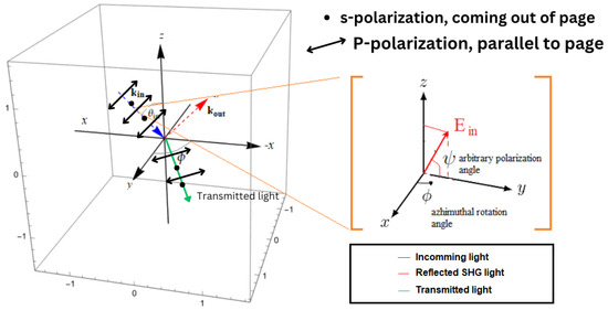 The applied coordinate system in our model is presented in Figure 2. The incoming fundamental and outgoing SHG fields are propagating along the plane. In this work, we do not limit ourselves to the four standard incoming p- and s-polarized incoming fields but instead generalized the model for arbitrary input polarization: