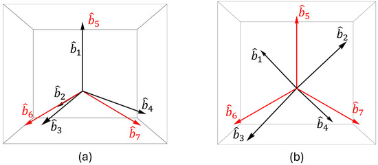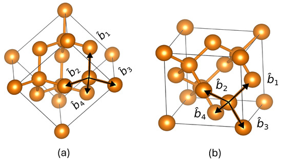 In the silicon structures Si(001) and Si(111) [14], the bond vector directions are illustrated by black arrows, labeled , and , as depicted in Figure 3. These bond vectors can be analyzed and described in terms of Cartesian coordinates. Drawing upon previous studies, the bond orientations of the Si(111) and Si(001) structures can be represented as follows [15]