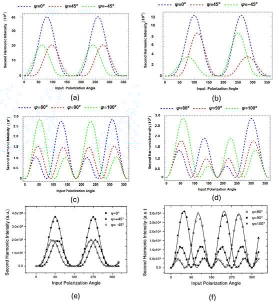 Total simulated (a–d) and experimental (e,f) RASHG intensity, where in (a,c) the normal z-axis of the Si substrate and the vertical MG bond vector are parallel (), whereas in (b,d) the tilting angle between the normal z-axis and is . The polarization angle is evaluated for , , and (left side), while , , and (right side). The RASHG experiments in (e,f) were reprinted/adapted with permission from Ref. [11]. 2000. American Chemical Society.