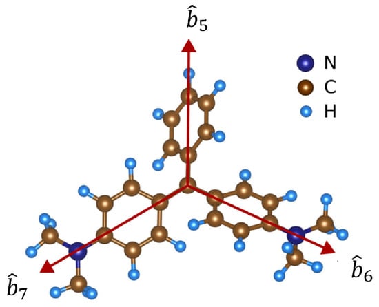 Atomic structure of isolated malachite green. Red arrows correspond to the vector direction of each branch of the molecule, i.e., , , and . Navy, gray, and cyan spheres represent the nitrogen, carbon, and hydrogen atoms, respectively. The structural models are visualized by using VESTA [24].