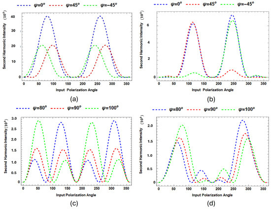 Figure 8 presents the predicted RASHG (Rotational Anisotropic Second Harmonic Generation) simulation plots comparing the second harmonic intensities for MG-Si(001) at different polarization input angles using the SBHM. The plots explore how these angles, combined with the presence or absence of a tilting angle, affect the total predicted RASHG intensity. In Figure 8a,b, the input polarization angles are , , and , while in Figure 8c,d, the input angles are , , and . For Figure 8a,c, no tilting angle is applied (), while Figure 8b,d incorporate a tilting angle of .