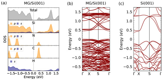 Density of states (a) and band structures (b) of MG/Si(001). The dominant contribution comes from the p-orbital of Si. Meanwhile, the p-orbital of carbon atom from MG creates acceptor states at the conduction band. The bandgap is about ∼ eV. (c) The band structure of Si(001) without MG.