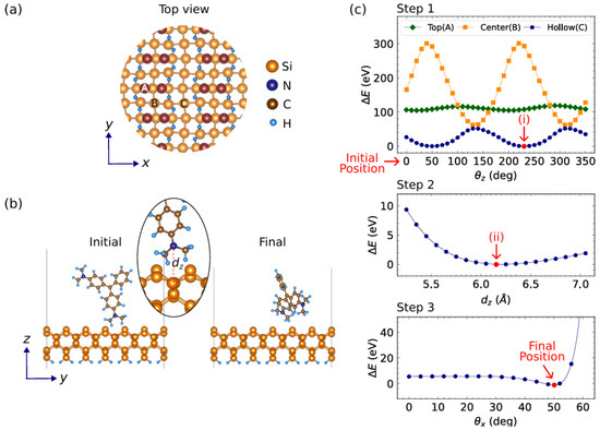 (a) Top view of the Si(001) surface. Red spheres represent the Si atoms in the top layer. Top, center, and hollow sites are assigned to A, B, and C, respectively. (b) Side view of the initial and final structures of MG/Si(001) system. (c) Evolution of the MG molecule orientation from its initial to final position as they seek the lowest energy, where corresponds to the distance between N and Si atoms at the hollow site whereas and refer to the tilting angle with respect to the z and x coordinate.