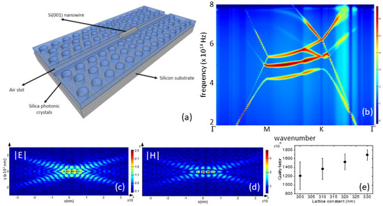 Since the SHG intensity is very small compared to the linear optics, we propose a method to enhance the RASHG signal through a photonic crystal cavity (PhC) [27]. In Figure 11a, we present a Si nanowire cavity inside an air-slot SiO PhC design, as demonstrated previously for an ultrahigh Q cavity [28]. We used finite-difference time-domain commercial software to simulate the electromagnetic fields inside the PhC. Further, we defined the frequency as 4.9 × 10 Hz, which closely matches the frequency of RASHG Si[001] [14]. For such a purpose, we defined the hole radius of 109 nm, while the lattice constants, a, vary between 300 and 330 nm. The air slot in the PhC [28] has parameters of width and height of , and the total size of the calculation is ×. For the nanowire, it has a length and side length of 2 and 0.17a, respectively. Figure 11b shows the calculated photonic bandstructure calculation with the bandgap between 4.4 and 5.4 × 10 Hz. We found that the electric and magnetic fields are strongly confined in the Si nanowire, as shown in Figure 11c,d, respectively. The mode volume for the PhC can be estimated to be 0.18. For quality factors, we obtained the values between 1200 and 1800 and the highest value determined for a equal to 330 nm, as shown in Figure 11e.