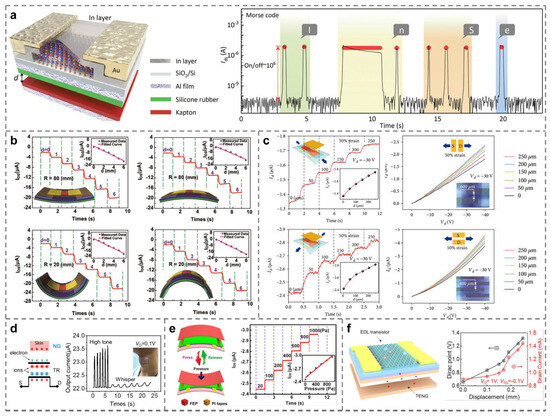 Tribotronic Smart Sensors. (a) Through tactile sensing, the Morse code of “InSe” is demonstrated [78]. (b,c) Relationship between the drain-source current and the bending or strain deformation detected by tribotronic strain sensors [75,83]. (d) Sensations of the tone with a tribotronic voice sensor [82]. (e) Structure and performance of a flexible organic tribotronic transistor (FOTT) for pressure sensing [77]. (f) An electric double layer (EDL) TFET for accurate displacement sensing [85].