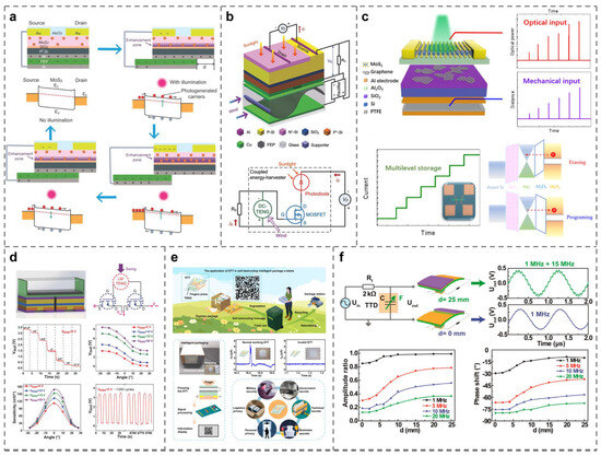 Tribotronic applications are coupled with other effects. (a) A photoresponsivity-enhanced MoS2 tribotronic phototransistor [69]. (b) The hybrid energy harvesting system consists of a TFET and a photodiode for simultaneously scavenging wind and solar energies [104]. (c) A multibit nonvolatile optoelectronic memory that can store both optical and mechanical stimulation information [103]. (d) The liquid metal-gated TFET is suitable for an electronic gradienter [109]. (e) TFETs used for degradable intelligent package e-labels [110]. (f) The tribotronic tuning diode (TDD) serving as a signal modulation component [87].