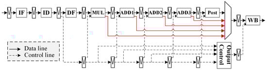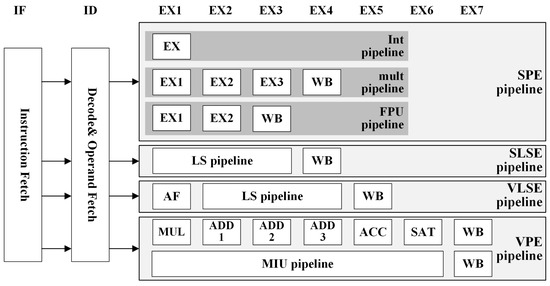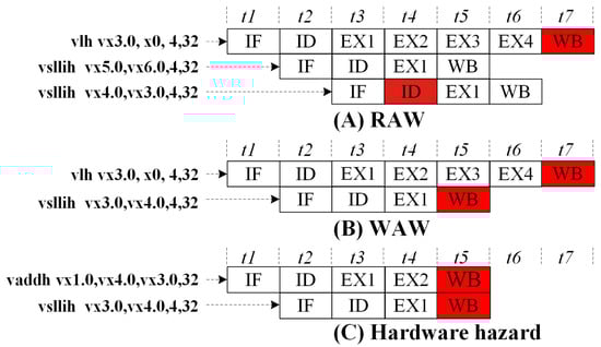 Application-oriented vector processors include general-purpose architectures such as AVX512 [6], ARM SVE [7], and RSIC-V RVV [8] as well as application-oriented DSP architectures like TI C66 [9], Qualcomm Hexagon [10], CEVA XC12 [11], XC16 [12], XC22 [13], and Tesla Dojo [14]. To facilitate compilation and user programming, most vector DSPs employ an RISC vector instruction architecture, where each instruction specifies a relatively limited function, which constrains the performance of DSPs. Based on application requirements and ASIP concepts [4], some DSPs combine multiple sequential instructions that are frequently used in single composite instruction while merging the RISC datapath into a multiple pipelined datapath [15]. This approach significantly enhances the performance of SIMD DSPs by accelerating frequently utilized functionalities. Consequently, the instruction set of ASIP DSPs differs from that of general-purpose processors. In certain fields, they often feature complex instruction set designs. For instance, in wireless communications, data are represented in IQ (In-phase, Quadrature) format, which is a complex data representation [16]. Common instructions for IQ data include complex addition, subtraction, and multiplication as well as multistep fused instructions, such as summation, minimum, and maximum calculations. The typical features of these instructions can be identified not only data parallel but also instruction fusion, the integration of multi-operations into one instruction, such as incorporating post-processing tasks like saturation, scaling, and rounding. Instruction fusion results in longer instruction pipelines. Extended pipelines can introduce data hazards, such as RAW (Read-After-Write), WAW (Write-After-Write) dependencies and hardware hazards. If data hazards are not effectively addressed, they can lead to significant performance degradation and even risks of computational errors.