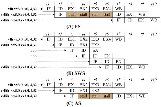 To address the aforementioned issues, superscalar processors employ register renaming and reservation techniques [19]. In contrast, DSPs typically utilize a complete stall hardware strategy, where the pipelined execution is blocked for instructions until the execution is completed, allowing subsequent instructions to issue later. This approach is logically straightforward and incurs few hardware overhead, which is referred to as full stall (FS). Alternatively, software-managed instruction scheduling can be employed to mitigate hazards, relying on advanced compilers to arrange instruction order and prevent data hazards, which is termed software schedule (SWS). The design concept presented in this paper introduces a scoreboard component that analyzes data hazards for predictable instruction behaviors and automatically stalls the pipeline, which is referred to as an auto-stall (AS). Figure 5 describes the processor’s different behaviors under these three strategies in the context of RAW as illustrated in Figure 4A.