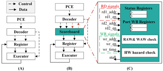 Based on algorithm analysis, we proposed a scoreboard module to address data hazards. Its architecture diagram is shown in Figure 6. This proposal utilizes a centralized scoreboard to predict processor behavior and control instruction dispatch. Figure 6A illustrates the architecture of the original processor, while Figure 6B depicts the architecture after the implementation of this proposal. The architecture incorporates a scoreboard module, which provides a unified instruction issue controller during the instruction dispatch stage.