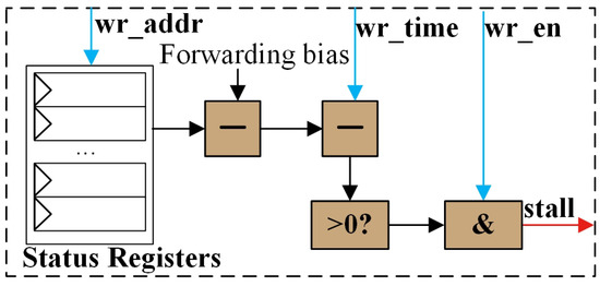The logic for the RAW and WAW check is designed to assess whether the current instruction’s read and write actions will cause data hazards. According to the proposed algorithm, this design utilizes the same hardware to evaluate both RAW and WAW conditions. Figure 7 illustrates the micro-architecture for RAW and WAW detection at each port. The distinction between RAW and WAW detection arises from the potential existence of forwarding logic at the read ports. Consequently, RAW detection requires the status value to be adjusted by subtracting the forwarding bias before comparing it with the wr_time to ascertain whether a RAW or WAW hazard exists at the port. In cases of WAW, or when RAW occurs without forwarding logic, the value of the forwarding bias is set to zero.