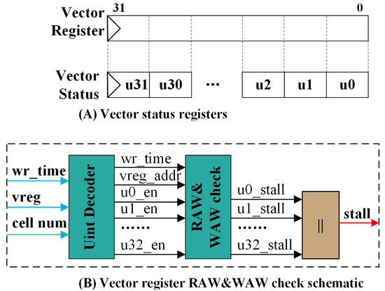 (A) Vector register and its status files. (B) Schematic for vector registers RAW and WAW check module.