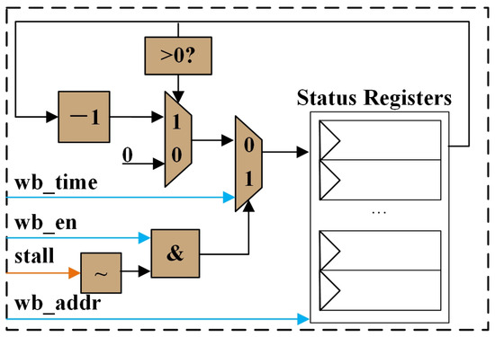 When a new write operation occurs, if the final determination from the scoreboard indicates that no stall happens, the value will be updated in the corresponding status register associated with that register. Conversely, if a stall occurs and the status register value is not zero, it will decrement by one; otherwise, the value will remain zero.