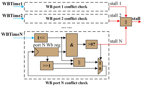 To address the issue of simultaneous write-backs, this design allows different write ports to write back simultaneously provided they do not target the same register. The RAW and WAW check module ensures that there are no conflicts in writing back to the same register. However, it cannot detect the situation where the same write port attempts to write back to different registers simultaneously. In the scoreboard, we introduced the HW hazard check module to monitor the port write-back status whose micro-architecture is illustrated in Figure 10.