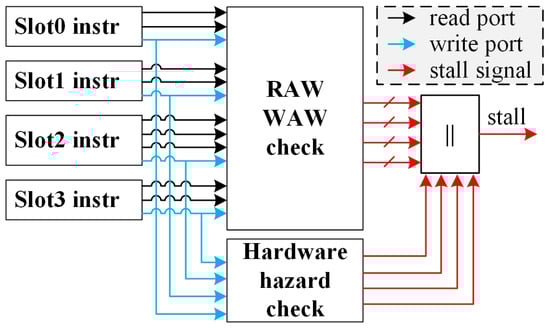 Let us take a glance at the literature. Ref. [20] explores the data hazard resolution in a simple five-stage pipeline RISC-V processor, utilizing a single-bit scoreboard to verify the validity of write-backs. This approach is suitable for short pipeline DSPs to tackle RAW and WAW hazards, but it is inefficient for detecting WAW in long pipelines. SiMT-DSP [21] presents a SIMT architecture DSP, where each sub-core employs a CISC design that utilizes full stall (FS) logic in the data pipeline to await valid data from memory. Ref. [22] designs a vector DSP with data hazard detection, featuring an equally long pipeline architecture, allowing vector register access by row or column. This design incorporates vector register data hazard detection during the instruction issue phase, evaluating hazards on a coarse-grained basis that is either row or column-wise. However, it lacks fine-grained vector register data hazard detection and exhibits low efficiency in WAW detection. None of these methods effectively address the data hazard issue in long pipeline DSPs.