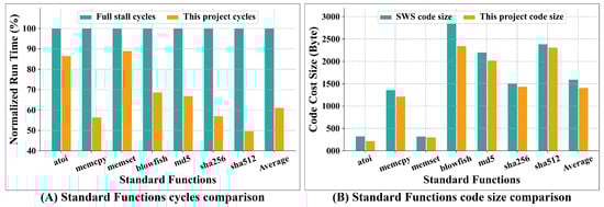 The code size can be obtained from the section of the compiled ELF executable file. Our compiler scheduler is used in the case of Software Scheduling (SWS) for instruction scheduling. NOP instructions are inserted if two instructions exhibit data hazards and there are no unrelated instructions available for filling the gap. The elimination of NOP insertion is the contributing factor to reduce the program memory cost for AS conditions. Figure 14B compares the instruction memory requirements of this project with those of SWS for standard functions. The average code cost size in this project has been reduced by 11.62%. For DSPs, which often employ Harvard architecture, the program memory is typically SRAM (Static Random Access Memory). The cost size reduction allows the processor to utilize smaller SRAM or enables the same-sized SRAM to accommodate a greater number of instructions.