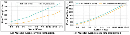 Figure 16B illustrates the comparison of the code size for matrix multiplication kernels between this project and the SWS scenario, where software scheduling is employed. This project achieves a reduction in code cost by 9.13%.