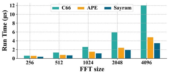 We have also simulated various typical signal processing algorithms on Sayram and compared its performance with that of the commercial TI C66x core [9] and APE [38], which is a DSP featuring similar process nodes and computational resources. Sayram and APE both operate at 1 GHz, while the C66x core runs at 1.25 GHz. The performance data for the C66x and APE were obtained from ref. [38]. Figure 17 presents the execution time of a complex 16-bit fixed-point FFT algorithm. Using the scoreboard proposed in this paper, the Sayram processor achieves an average speedup of 2.97× (). compared to the C66 core and 1.33× compared to APE for fixed-point FFT.