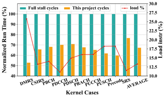 Due to the varying execution times of the functions, the displayed values are normalized. From the experimental results, it can be observed from Figure 18 that after implementing this solution, the average runtime decreased by 32.75% compared to the full stall scenario. Notably, the DMRS, which has high memory access requirements as the red lines showed in Figure 18, saw a runtime reduction of 47.21%.