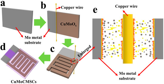 The electrochemical performance of CMSCs is greatly dependent on their electrode materials, electrolyte, and device architecture. Among these three main parameters, electrode material selection is the most important one for fabricating efficient CMSCs. Currently, carbon-related materials (like graphene [20,21], the carbon nanotube [22,23], and porous carbon [24,25]), single metal oxides/hydroxides (such as MnO2 [26], VO0.2 [27], RuO2 [28,29], MoOx [6], Co3O4 [30,31], CuO [32,33], Fe1−xO [7], and FeOOH [34]), and conducting polymers (like poly(3,4-ethylenedioxythiophene) [35,36], polypyrrole [37,38], and polyaniline [39]) are the most popular in the supercapacitors application. However, carbon-based materials show a great limitation in their low energy density whereas conducting polymers are hindered by their low structural stability. Therefore, single metal oxides/hydroxides providing high capacitance in theory and abundant materials sources attract intense attention from researchers [40,41]. Unfortunately, the poor electroconductivity of single metal oxides/hydroxides limits their further development in various fields. In recent years, more researchers’ interest has been focused on developing single metal oxides/hydroxides with element doping, nanostructures, and vacancies, preparing single metal oxide/hydroxide-based composites using high-conducting additives, and synthesizing binary metal oxides (BMOs) combined with two different single metal oxide [42,43,44]. Among these strategies, BMOs show great potential for constructing supercapacitor electrodes with excellent capacitive characteristics as they could provide multiple oxidation states for promoting the transport efficiency of a redox charge [45]. For instance, Mohammadi et al. used a hydrothermal strategy to prepare flexible supercapacitor electrodes with dandelion-shape CoMoO4–CoMoO4 core-shell nanostructure materials, providing a superior capacity (1548 F g−1 at 1 A g−1) with an excellent capacitance retention (94% for 5000 cycles). The core-shell nanostructure and multiple oxidation state of CoMoO4–CoMoO4 provided plentiful active sites as well as fastened the electronic transport speed, which lead to a good capacitive behavior of the whole electrodes. Xu et al. [46] combined a microwave-aided hydrothermal method and calcination to prepare ZnMoO4 nanosheet arrays on nickel foam with 3D frameworks for a supercapacitor electrode, offering a good capacity value of 1212 F g−1 at 1 A g−1 and a superior rate performance. The 3D frameworks, nanosheet structure, and polyvalent state of ZnMoO4 facilitated reduced electronic–ionic migration paths and, thus, enhanced the electrodes performance. Feng et al. [47] utilized a combined method of chemical vapor deposition and hydrothermal reaction to prepared NiMoO4–graphene composite electrodes, which provided a satisfied capacitance value (1913 F g−1 at 1 A g−1). The introduction of high-electroconductivity filler graphene and multiple oxidation states greatly boosted the electroconductivity of NiMoO4, and, thus, an enhanced performance was gained. Sivakumar et al. [48] synthesized oxygen-defect-enriched flower-like NiMoO4 (Od-NiMoO4) nanomaterials for the hybrid supercapacitor using a combination of the hydrothermal method and thermal treatment strategy in a specific argon-gas environment. It was proven that Od-NiMoO4-based electrodes offered a higher capacity (789 mAh g−1 at 1 A g−1) and better rate performance with respect to that of NiMoO4 with oxygen vacancy. The is benefiting from the enhanced electroconductivity of NiMoO4 triggered by oxygen defects, and a high surface area, as well as multiple oxidation states. Recently, copper molybdates receive concentrated attention because of its high theoretical capacitance, good morphologies, eco-friendliness, and relatively low cost [49]. For instance, Shenjini et al. grew CuMoO4 on N-doped reduced graphene oxide (NrGO) to form a CuMoO4–NrGO nanocomposite for supercapacitor application using a combined technique of the modified Hummer’s method, calcined treatment, and hydrothermal strategy. The results suggested that good redox behavior was achieved by the CuMoO4–NrGO nanocomposite because high-electroconductivity NrGO and the poly-oxidation state of CuMoO4 improved the electroconductivity of the CuMoO4–NrGO electrodes. Alagarsamy et al. [50] also combined the hydrothermal method and ultrasonic methods to synthesize CuMoO4 on graphene-oxide nanoribbons (GON) for obtaining CuMoO4–GON composite electrodes, which offered a high capacitance value (865 F g−1 at 1 A g−1). The benefits from the high surface area, multivalent state, and conductive-additive assistance of the CuMoO4–GON composite, which provided sufficient active sites and conductive paths for electron/ion movement. Although a great amount of effort has been tried to boost the electrochemical performance of copper molybdates, their complex fabrication procedures greatly hinder their development and application. Particularly, there is a lack of reports on the one-step fabrication of copper-molybdate-based integrated microelectrodes for CMSC application. Moreover, the size and shape of the microelectrodes also play an important role in the capacitive performance of CMSCs. It was reported that CMSCs with an interdigital shape facilitated transporting electrolyte ions in a transverse direction, which boosted the ion transfer efficiency. In addition, the interdigital CMSCs are easy to be integrated with other electronics on the plane. As a result, interdigital CMSCs attracted concentrated attention from researchers [11,51]. Therefore, this encourages us to concentrate our research interest on simplifying the manufacturing process of CuMoOx-binary-metal-oxide-based integrated microelectrodes with a remarkable redox behavior for CMSCs with an interdigital shape.