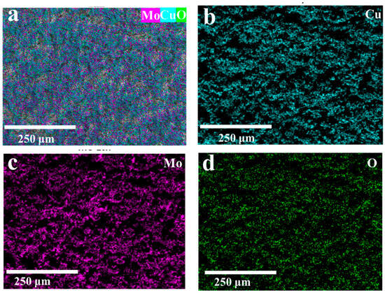 SEM-EDS analysis results for CuMoOx: distribution diagram of different elements—(a) Cu, Mo, and O; (b) Cu; (c) Mo; and (d) O.