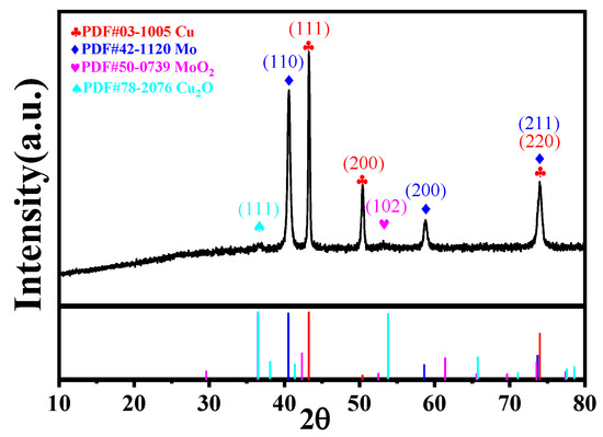 XRD patterns equipped with PDF card number for CuMoOx prepared by one-step NCEDM.