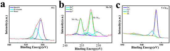XPS patterns of (a) O1s, (b) Mo 3d, and (c) Cu 2p3/2 for CuMoOx prepared by one-step NCEDM.