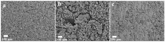 SEM pictures of electrode materials for (a) CuMoCMSCs60, (b) CuMoCMSCs80, and (c) CuMoCMSCs100 fabricated by one-step NCEDM.