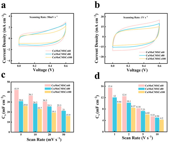 CVs of CuMoCMSCs60, CuMoCMSCs80, and CuMoCMSCs100 at (a) 50 mV s−1 and (b) 1 V s−1, respectively; capacitance in comparison for CuMoCMSCs60, CuMoCMSCs80, and CuMoCMSCs100 within (c) 5–50 mV s−1 and (d) 1–10 V s−1, respectively.