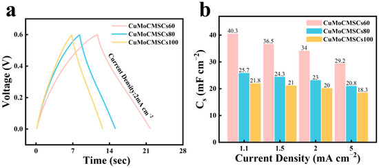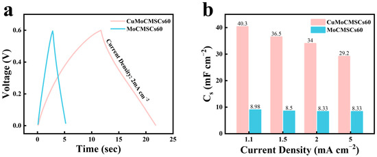 A similar phenomenon was observed at other operating scan rates of 2, 5, and 10 V s−1 (Figure 9b,c). As a result, CuMoCMSCs60 obtained a higher capacitance with respect to MoCMSCs60 at all operating super-high scan rates (Figure 9d). This is owing to the binary metal oxides of CuMoOx equipped with multiple valence states of the copper ion and molybdenum ion. Moreover, CuMoCMSCs60 owns the merits of 2.5D binder-free electrode architecture design, the micro-/nanostructure particle synthesis, and oxygen vacancy introduction. These merits are conducive for them to obtain a high capacitance, especially at super-high operating scan rates. Therefore, CuMoCMSCs60 obtained a high capacitance of 15.4 mF cm−2 at 1 V s−1 and maintained 5.33 mF cm−2 at 10 V s−1. This scan rate of 10 V s−1 operated with CuMoCMSCs60 is about 50–100 times higher than that of the CuMoO4–graphene-composite-based supercapacitor synthesized by the hydrothermal method [77], CuMnO2-reduced-graphene-oxide-nanocomposite-based supercapacitor prepared by a combination of the modified Hummers method and hydrothermal strategy [78], Cu3Mo2O9//La2Mo3O12 supercapacitors fabricated by combining the co-precipitation route and annealing method [79], and the flower-shape 3D NiMoOx nanomaterial for the supercapacitor prepared by a combination of the hydrothermal strategy and thermal-treatment process in an inert-gas atmosphere [48]. GCD testing was further performed to verify the electrochemical performance of MoCMSCs60 and CuMoCMSCs60. Figure 10a proved that both MoCMSCs60 and CuMoCMSCs60 achieved a symmetric GCD profile, which indicated good capacitive behavior was gained. Moreover, with respect to MoCMSCs60, CuMoCMSCs60 showed a much longer discharging time at 2 mA cm−2, which means a larger capacitance was obtained. Figure 10b demonstrates that the capacitance of CuMoCMSCs60 is around 4 times higher than that of MoCMSCs60 at all the operating current densities of 1.1, 1.5, 2, and 5 mA cm−2. This is because binary metal oxides of CuMoOx facilitated a faster electronic transport rate than the single metal oxide of MoOx.