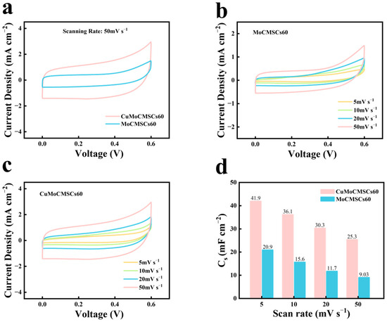 CVs of (a) MoCMSCs60 and CuMoCMSCs60 at 50 mV s−1, (b) MoCMSCs60 (5–50 mV s−1) and (c) CuMoCMSCs60 (5–50 mV s−1), and (d) capacitance in comparison for MoCMSCs60 and CuMoCMSCs60.