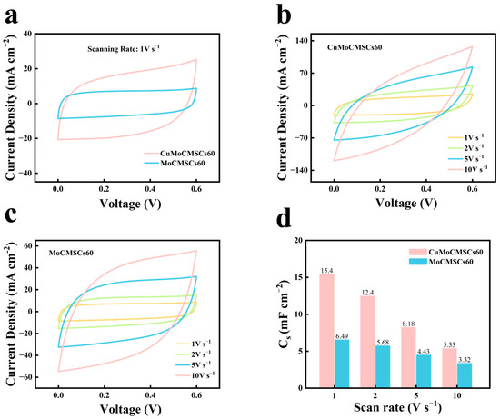 Figure 9 demonstrates the CV investigations of MoCMSCs60 and CuMoCMSCs60 machined by the NCEDM strategy at a super-high potential range of 1–10 V s−1. Figure 9a depicts that the current density of CuMoCMSCs60 is much larger than that of MoCMSCs60 at 1 V s−1, which is consistent with the results presented in Figure 8a.