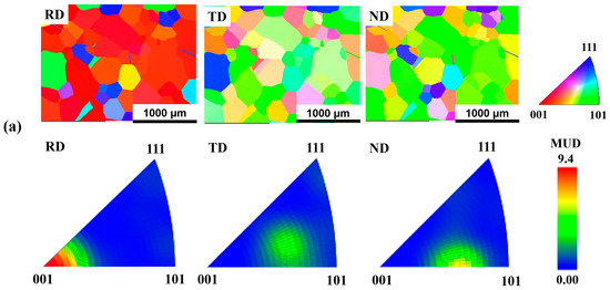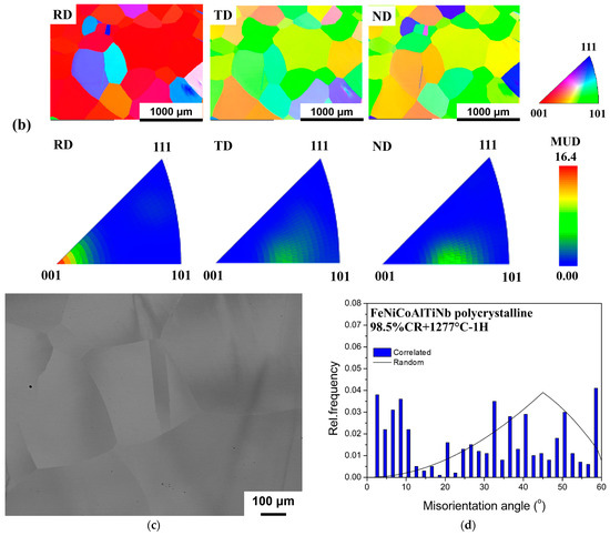 - The EBSD results reveal that the texture intensity and grain size increased as the annealing time increased from 0.5 to 1 h. After annealing at 1277 °C for 1 h, FeNiCoAlTiNb 98.5%CR showed a strong texture intensity in the <100> orientation, the value of which was 16.4 mud, and the average grain size was 400 μm. The volume fraction of LABs was 15.7%. The ODF results show the Goss texture and brass texture of the 98.5%CR sample after annealing;