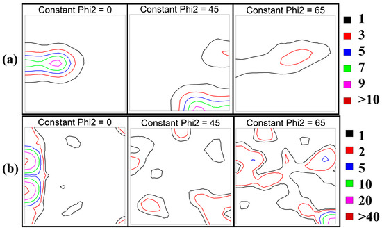 Figure 2a,b show the ODFs (phi 2 = 0°, 45°, and 65° sections) for 98.5%CR and 98.5%CR + 1277 °C, 1 h. Copper ({112} ⟨111⟩), brass ({110}⟨112⟩), and Goss ({110}⟨001⟩) textures are the three major components in FeNiCoAlTiNb cold-rolling alloys [31]. The 98.5%CR sample showed a strong rolling texture in terms of both brass ({110}⟨112⟩) and Goss ({110}⟨001⟩). It showed a weak copper texture. f(g) is the orientation density and is commonly used in the cold-rolling textures of FCC metals. f(g)max represents the maximum value of orientation density. The textural intensity was f(g)max = 10.79 for brass texture, f(g)max = 9.07 for Goss texture, and f(g)max = 4.14 for copper texture. The cold-rolled sample after annealing showed a texture intensity of f(g)max = 45.14 for the brass texture and f(g)max = 46.14 for the Goss texture. The textural intensities of both the Goss and brass textures increased, and the intensity of the copper texture decreased. Furthermore, the f(g)max of recrystallization texture reached 46.14. From the ODFs results, we see that the two major components of FeNiCoAlTiNb 98.5%CR + 1277 °C, 1 h were brass ({110}⟨112⟩) and Goss ({110}⟨001⟩) texture. Moreover, many researchers have shown that cold-rolling above 98% forms {hkl}<100> recrystallization textures.