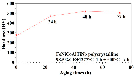 Hardness of a FeNiCoAlTiNb 98.5%CR with a different aging treatment duration.