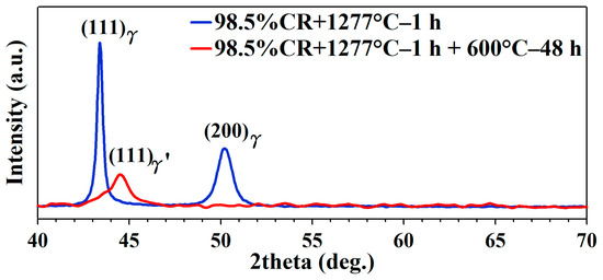 Figure 4 presents the XRD patterns of the samples under different conditions, including 98.5%CR + 1277 °C, 1 h and 98.5%CR + 1277 °C, 1 h + 600 °C, 48 h. In the annealing sample, we see a strong peak in the (111) and (200) planes for the austenite (γ, FCC) structure. The intensity of the (111) peak was higher compared to the (200) peak. In the aged samples, a new peak was generated, and the two theta values reached between 44 and 45 degrees. In the reference results, this peak was identified in precipitates, and its plane was (111), contributing (γ′, L12). The original (111) and (200) plane peaks of the annealing sample decreased after the aging heat treatment. Similar phenomena were also reported by Zhou et al. [33]. In their studies, the peak intensity of austenite (γ, FCC) decreased and the peak intensity of precipitate (γ′, L12) increased with the aging times 24 to 96 h. Beta phases appeared between 64 and 65 degrees. For our sample, the peak of the beta phase was unclear compared to that of Fu et al. [31].