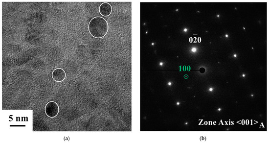 Figure 5a shows the bright-field (BF) TEM image of an aged FeNiCoAlTiNb sample. The white circle shows the diameter of the precipitate. The precipitate size was measured as 10 nm. The SAED patterns of the aged sample are shown in Figure 5b. The axial zone is <001>. Based on the diffraction pattern results, we can infer that the austenite phase has an fcc structure and the precipitate has an L12 structure. In the results for the FeNiCoAlNb single crystal with a <100> orientation, the diameter of the 700 °C, 3 h aged FeNiCoAlNb single crystal was around 5 nm [21]. For the FeNiCoAlTiB alloy aged at 600 °C for 4 h and 600 °C for 24 h, the precipitate sizes were 4 and 10 nm, respectively [26,27].