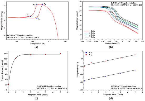 Figure 6a,b present the magnetic results for the FeNiCoAlTiNb sample aged under magnetic fields of 0.05, 1, 3, 5, and 7 Tesla. The transformation temperatures of the aged sample were determined by the tangent line method, as shown in Figure 6a. The values of the transformation temperatures and temperature hysteresis under different magnetic fields are summarized in Table 1. The austenite finish temperature (Af) here = −40 °C and the martensite start temperature (Ms) = −77 °C. The temperature hysteresis (ΔT) was calculated as |Af − Ms|, and its value ranged from 37 to 39 °C for the magnetic fields of 0.05, 1, 3, 5, and 7 Tesla. Figure 6b shows that magnetization increases with increases in the magnetic field from 1 to 7 Tesla. Figure 6c shows the relationship between magnetization and the magnetic field. The magnetization increased with an increasing magnetic field. When the magnetic field was 5 T, the magnetization almost reached its saturation value. The maximum value of magnetization was 140 emu/g at 7 Tesla. The results indicate that the magnetization increased with an increasing magnetic field. Figure 6d presents transformation temperatures (Af and Ms) as a function of the magnetic field at various values (0.05~7 Tesla). From this result, we can infer that the transformation temperature increases as the magnetic field increases.