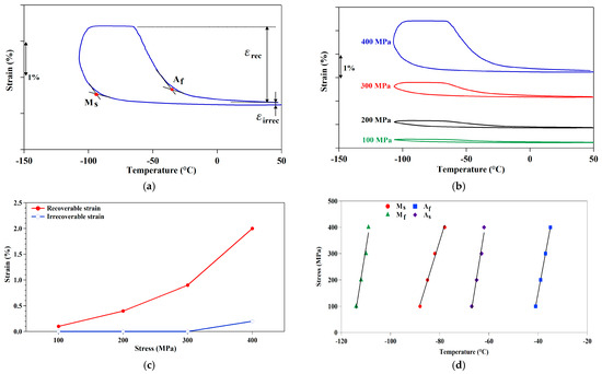Shape memory characteristics of three-point bending test for the aged FeNiCoAlTiNb sample: (a) illustration of how to obtain recoverable strain, irrecoverable strain, and transformation temperatures from thermal cyclic tests, (b) strain vs. temperatures under different applied stress values, (c) recoverable and irrecoverable strains at various stress, and (d) stress vs. transformation temperatures responses.
