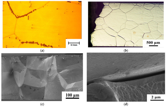 An optical microscope image of an aged sample: (a) before and (b) after the three-point bending test. (c,d) show high-magnification BSE images of the cross-sections of three-point bending fracture surfaces.