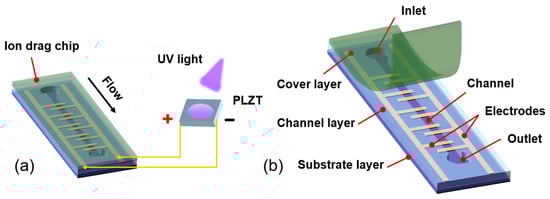 Figure 1a shows the conceptual schematic of the PLZT-based ion drag pump, which consists of a PLZT ceramic served as the energy device and an ion drag pump chip. These two parts are electrically connected via wires. The ion drag pump chip is designed as a sandwich-like multilayer structure (i.e., the substrate layer, the channel layer, and the cover layer), shown in Figure 1b. Note that the interdigitated electrode structure is patterned on the substrate layer to realize an expected electric field, which actuates the dielectric fluid flowing in the channel layer. In order to avoid the dielectric breakdown, the cover layer and the substrate layer are supposed to be strictly dielectric. For this design, when the PLZT ceramic is exposed to UV light with a near 365 nm wavelength, a photovoltage appears between the two electrodes of the PLZT ceramic and increases rapidly because of the photoelectric effect. Then, the photovoltage generates a photoelectric field between the interdigitated electrodes. As shown in Figure 2, once the photoelectric field is high enough to overcome the energy barrier, field emission occurs and the electrons are injected from the cathode into the dielectric liquid in the flow channel. Here, the cathode and anode are regarded as the emitter and collector, respectively. Then, the generated electrons are adhered on neutral molecules, causing these molecules to become ions. With the electric field between the interdigitated electrodes, these resulting ions can be actuated to the anode and discharged, dragging neutral fluid and thus leading to fluid flow. After the UV light is removed, the fluid flow in the channel stops because of the absence of the photovoltage. As discussed above, such a developed photo-induced ion drag pump based on the PLZT ceramic is expected to realize a controllable fluid flow via photovoltage. Furthermore, due to not using external power equipment but the PLZT patch as the energy source, this photo-induced ion drag pump is easy to miniaturize.