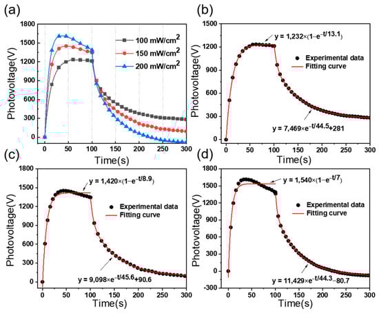 The output characteristics of photovoltage for PLZT ceramic. (a) Plot of photovoltage versus time under different UV light intensities. The fitting and experimental curve of photovoltage under UV light intensities of (b) 100 mW/cm2, (c) 150 mW/cm2, and (d) 200 mW/cm2.
