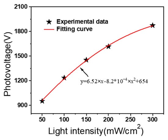 In order to investigate the photovoltage characteristics of the PLZT ceramic, numerous experiments are carried out under different intensities, including 100, 150, and 200 mW/cm2. As shown in Figure 4a, when the PLZT ceramic is irradiated by a low light intensity UV light (i.e., 100 mW/cm2), a rapidly increasing photovoltage between the two electrodes of the PLZT ceramic occurs and stabilizes over time. After removing the UV light, the generated photovoltage decreases at a relatively slower rate, compared with the increasing rate of the photovoltage. Clearly, high light intensity leads to an increase of the peak photovoltage. However, at high light intensity, such as 150 and 200 mW/cm2, a trend of first increasing and then decreasing occurs, as shown in Figure 4a. Figure 4b–d depict the experimental data and the fitting curve of the photovoltage during the light phase and light-stopping phase, and the fitting expressions of photovoltage under the light intensities of 100, 150, and 200 mW/cm2 by using Equations (3) and (4) are shown in Figure 4b–d. Moreover, the photovoltage responses of 50 and 300 mW/cm2 are also tested in order to obtain the fitting curve between the light intensity and the peak photovoltage, shown in Figure 5, which is used for the EHD simulations in Section 3.